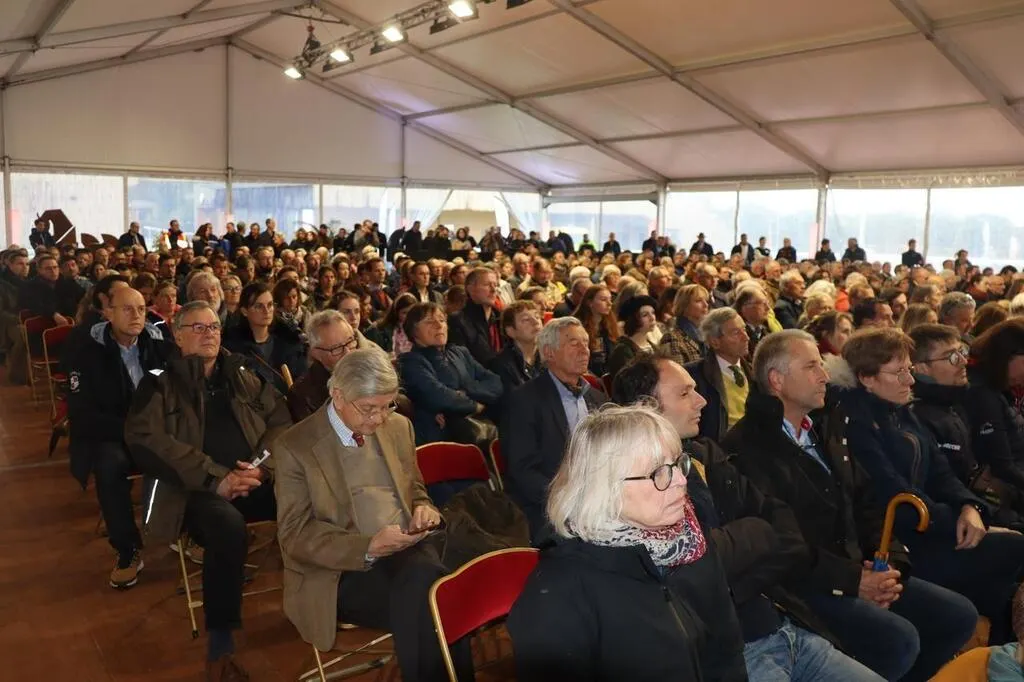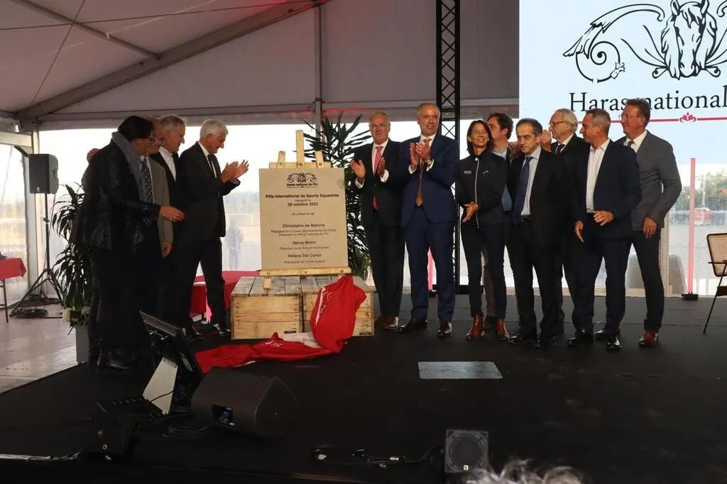 Une plaque mémorielle a été dévoilée et sera apposée sur le Pise pour se souvenir de cette journée d’inauguration, en présence de Christophe De Balorre, président du Département ; Hervé Morin, président de la Région Normandie ; Sébastien Jallet, préfet, et de personnalités des sports, de l’élevage et de la recherche. © Ouest-France