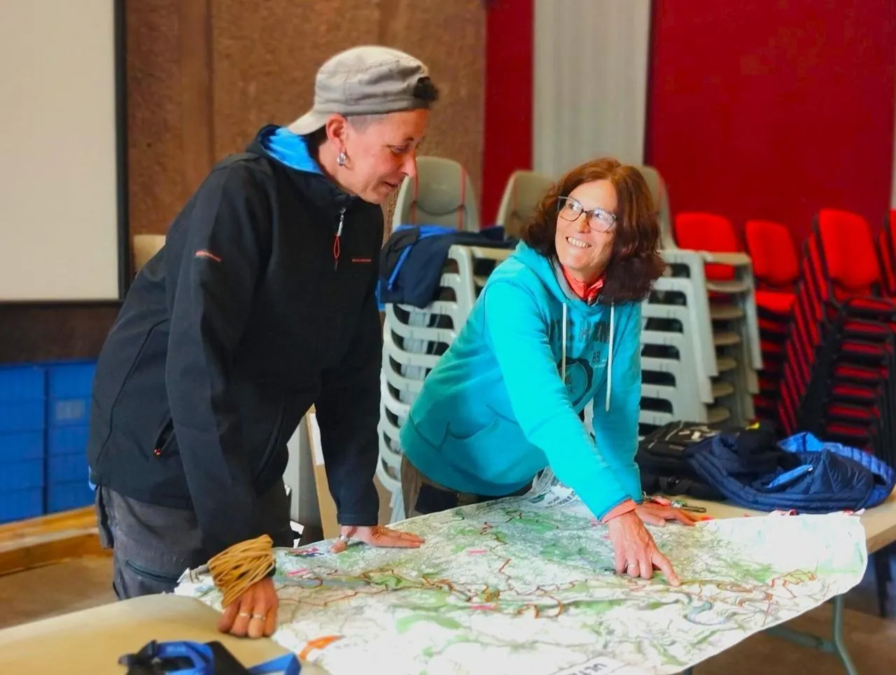 Odile (à droite) et Juliette ont sorti la carte pour savoir où installer le balisage pour le trail de la Roche d’Oëtre, près de Flers (Orne). © Ouest-France