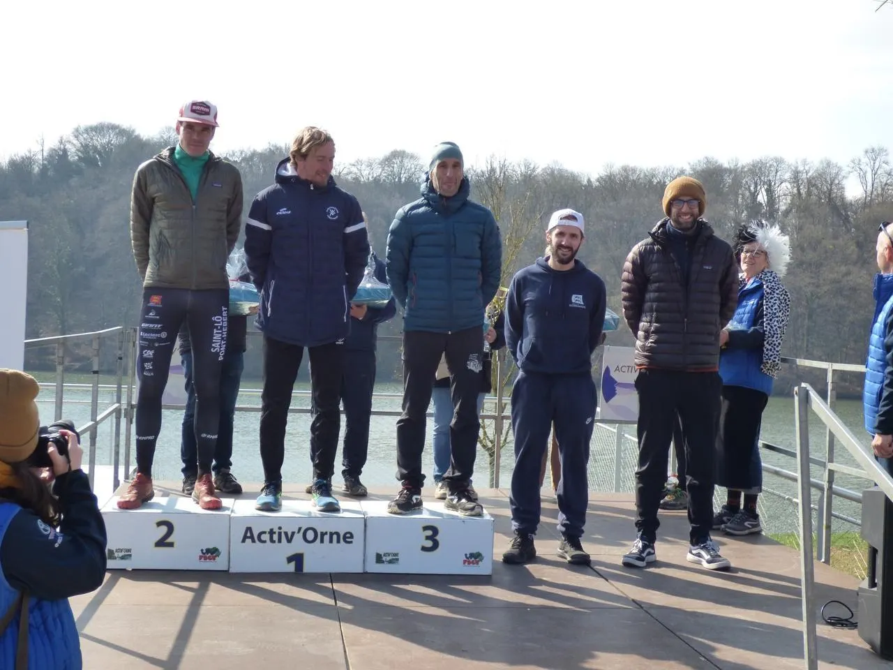 Le podium 2025 du trail du Lac, avec le duo organisateur Guillaume (avec la casquette) et Bruno Bechet, à droite. © Archives Ouest-France