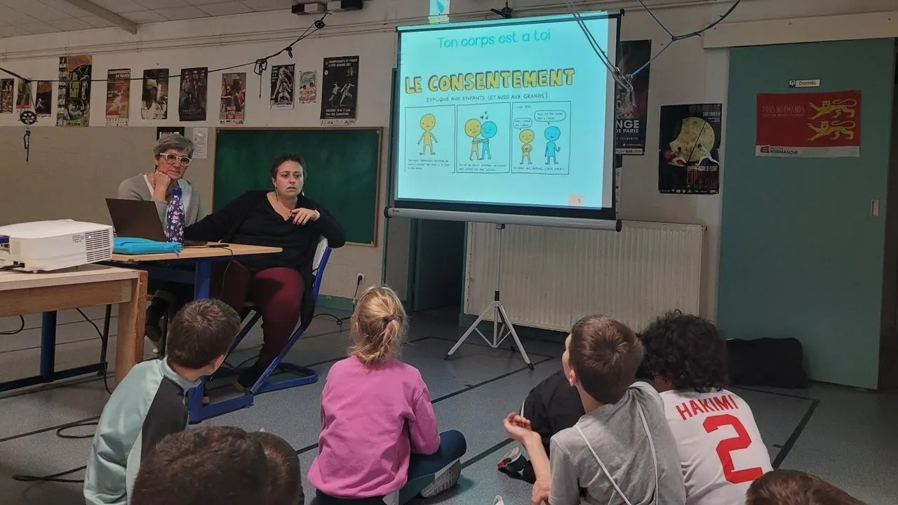 Véronique Coutance (à gauche) et Hélène Kozaczyk (à droite) font le point avec les enfants autour de la notion de consentement. © Ouest-France
