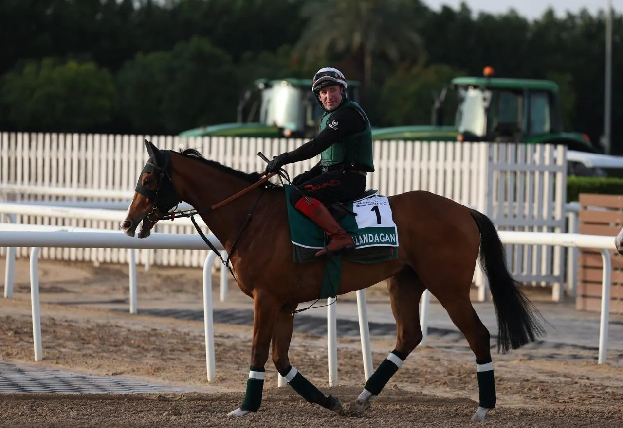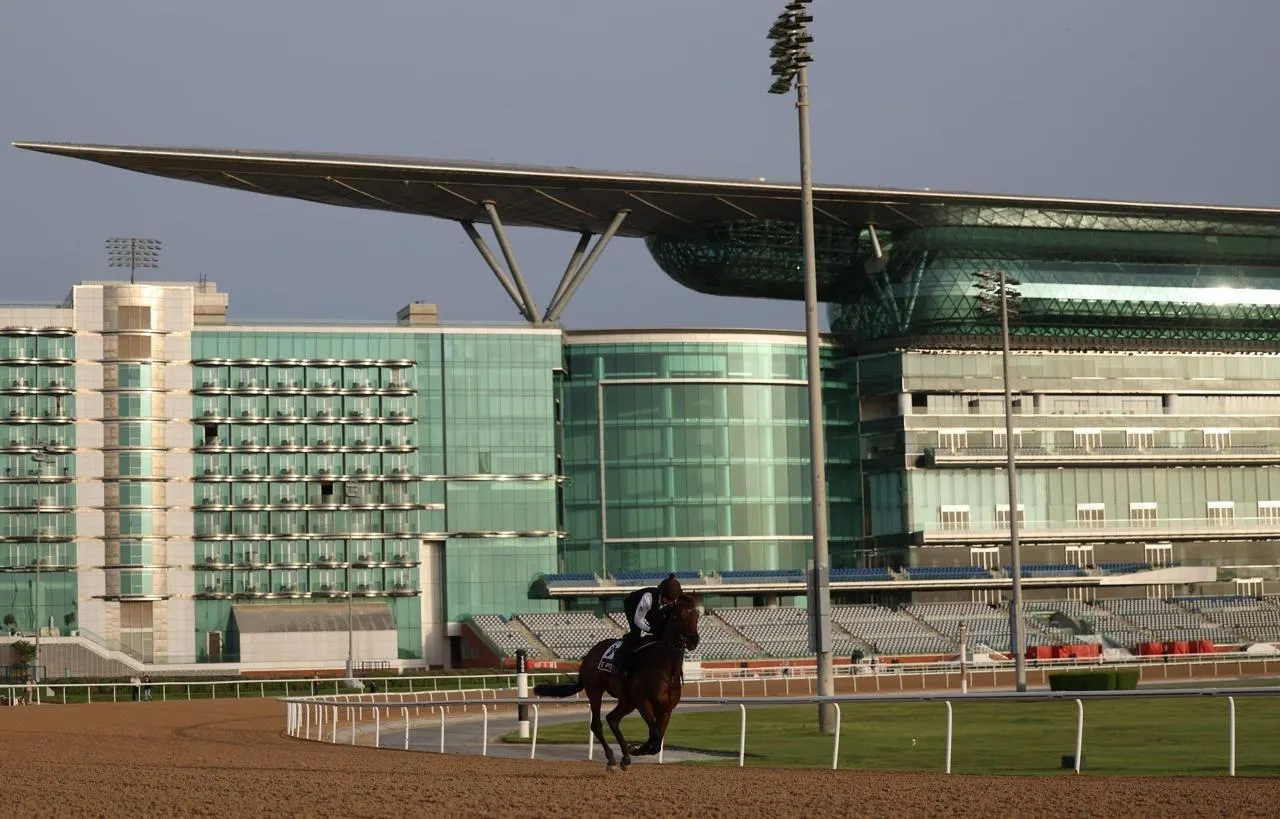 Cheval à l’entraînement cette semaine à l’hippodrome de Meydan, théâtre du « Super Saturday », la réunion hippique de l’année à Dubaï. © EPA/MAXPPP
