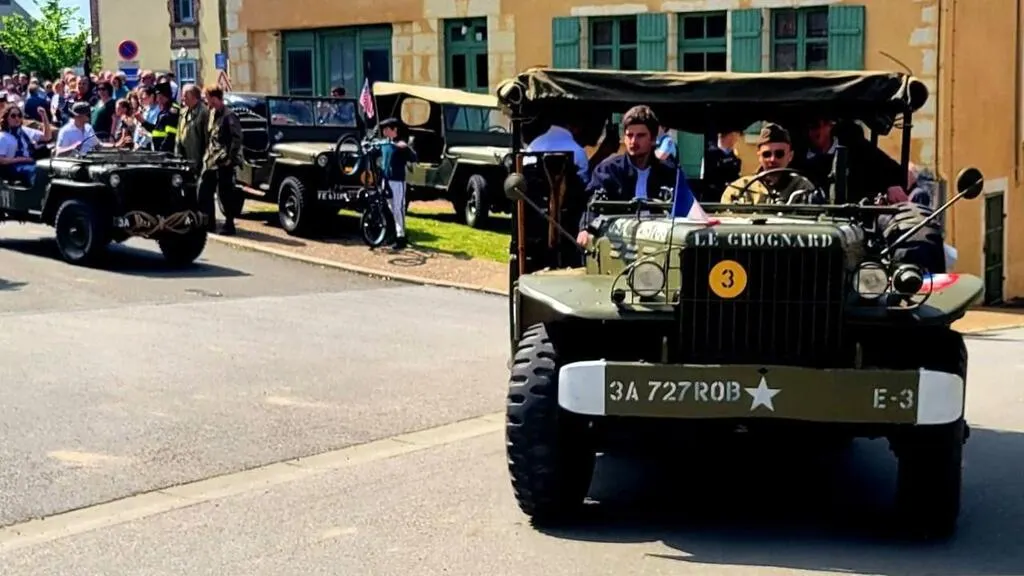 Un camion de guerre américain Dodge en tête de cortège, lors du passage de la flamme de la Liberté à Mâle (Orne). © Ouest-France