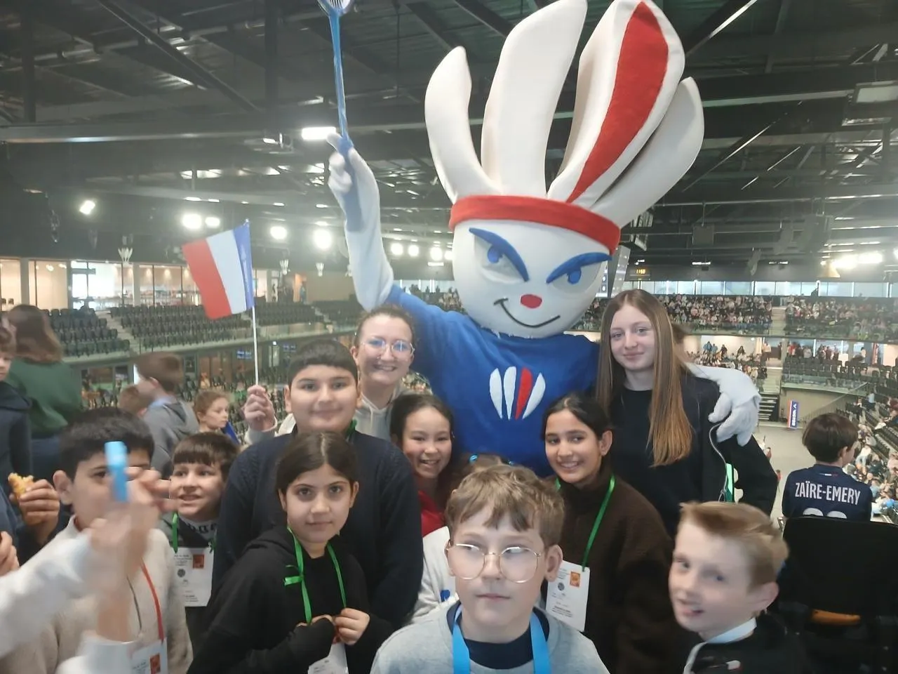 Plus de 2 700 enfants et adolescents d’écoles primaires, collèges et lycées normands ont suivi la première journée des championnats de France de badminton au palais des sports de Caen-la-Mer (Calvados). Au centre, la mascotte « Plumy » entourée d’enfants. Pendant la matinée, elle a distribué des drapeaux aux élèves. © OUEST-FRANCE