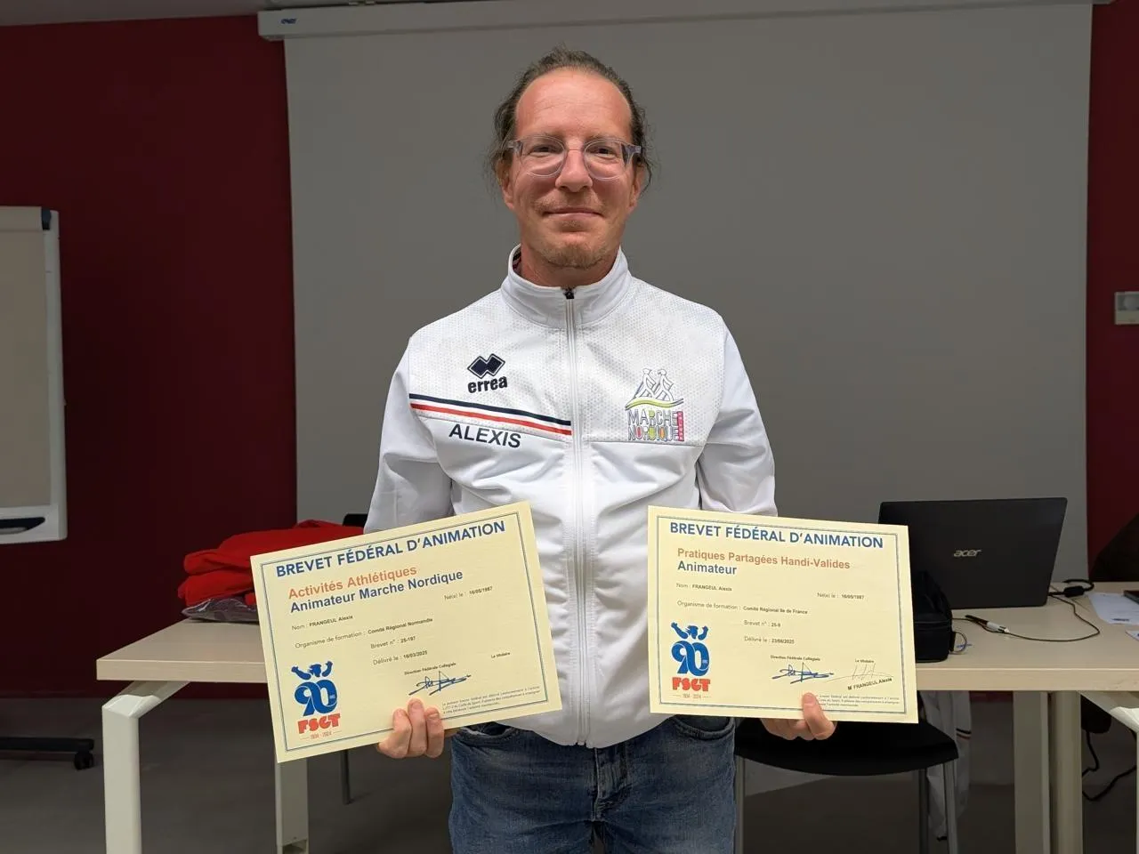 Deux diplômes en marche nordique ont été remis à Alexis Frangeul, lors de l’assemblée générale du club AS Enseignants, à Alençon (Orne). Le trentenaire, atteint du syndrome de Little, doit pratiquer marche et étirements quotidiennement.