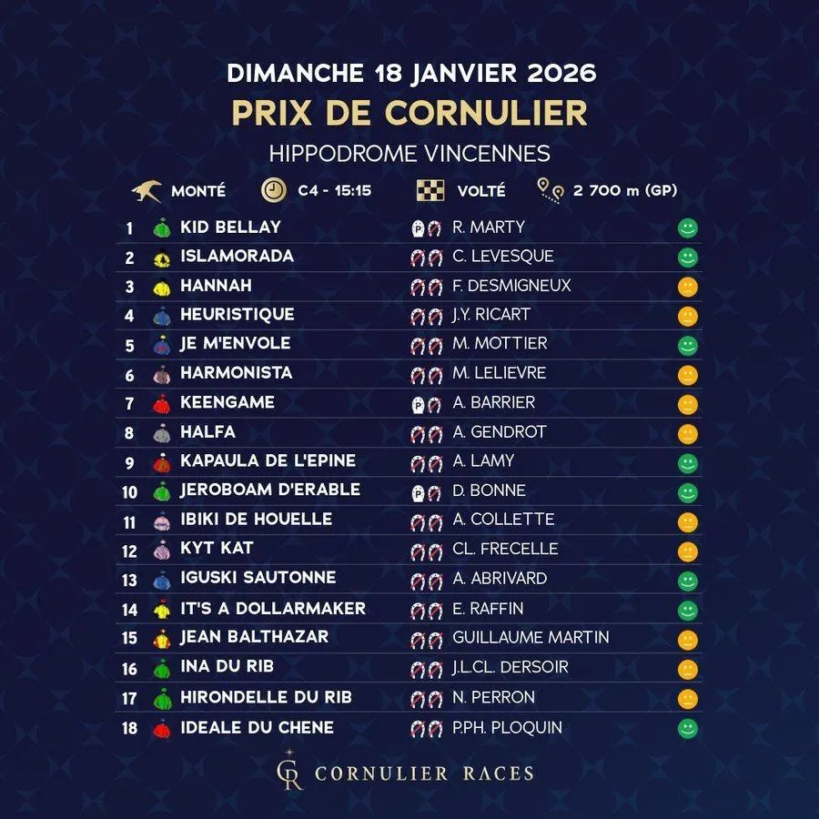 Les 18Â partants du prix de Cornulier 2026. Le TROT
