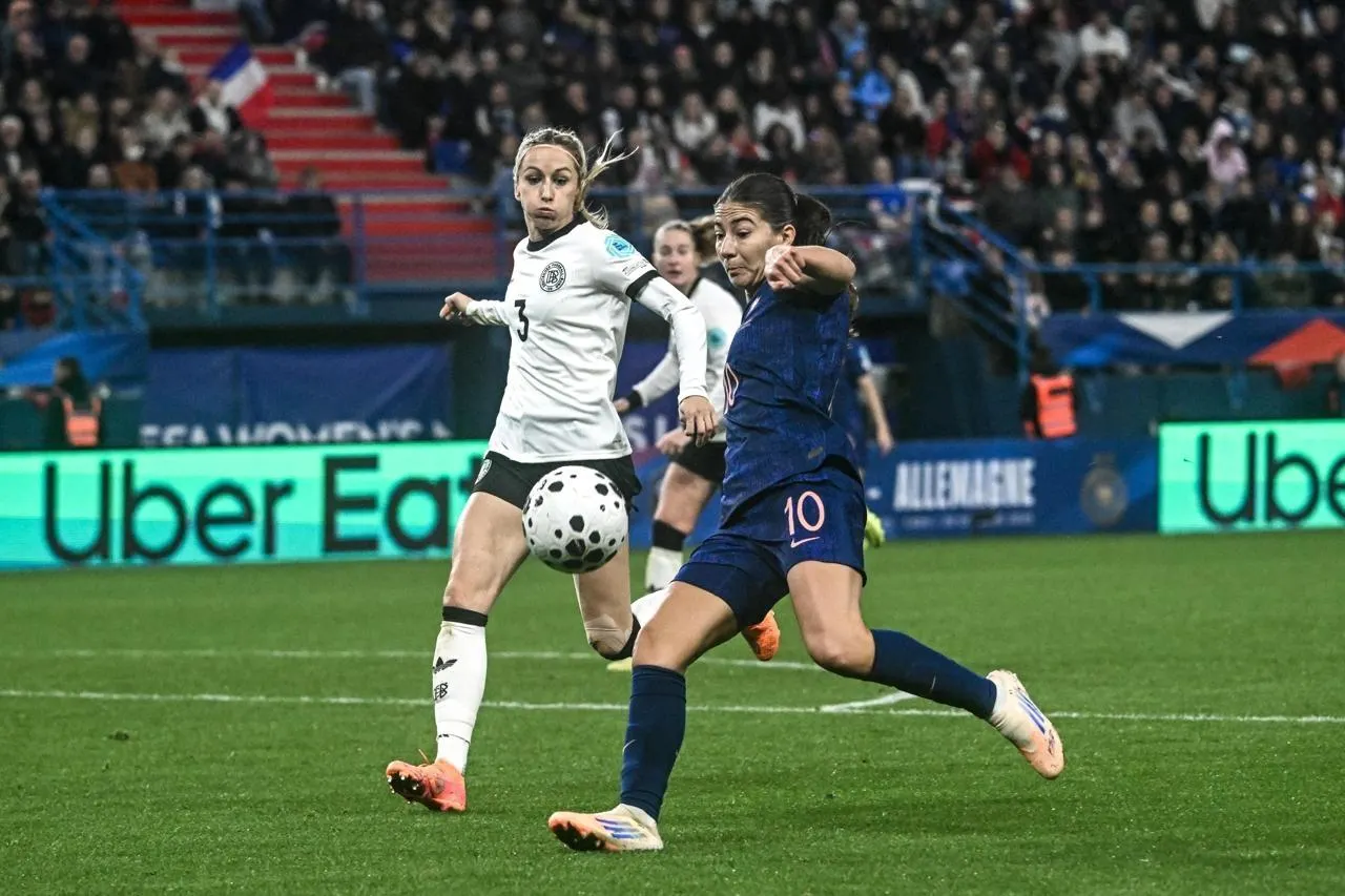 Clara Mateo, ici avec l’équipe de France, lors du match de Ligue des nations, le 28 octobre 2025 au stade d’Ornano de Caen. © Martin ROCHE / Ouest-France