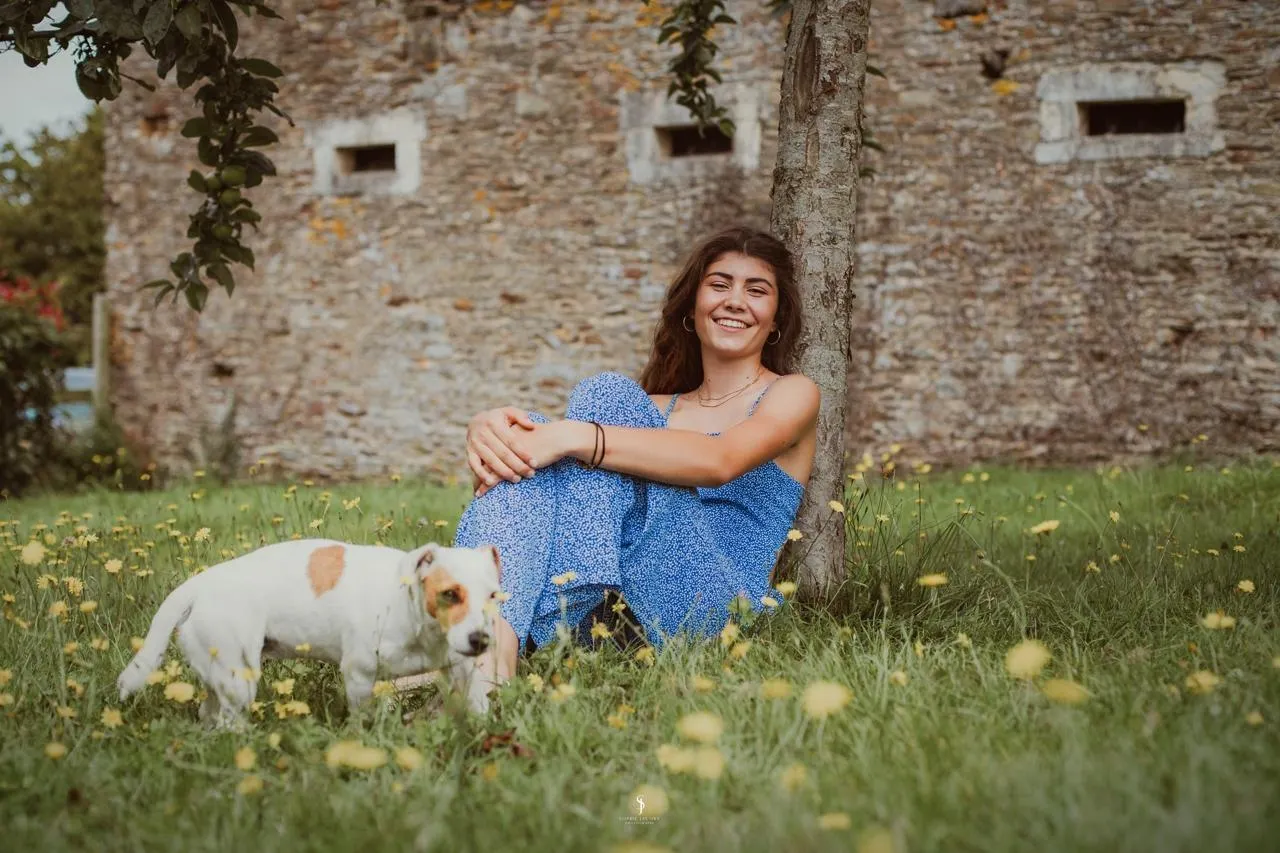 Lou Fossey chez elle dans le Bocage calvadosien, en compagnie de son chien. © Lou Fossey
