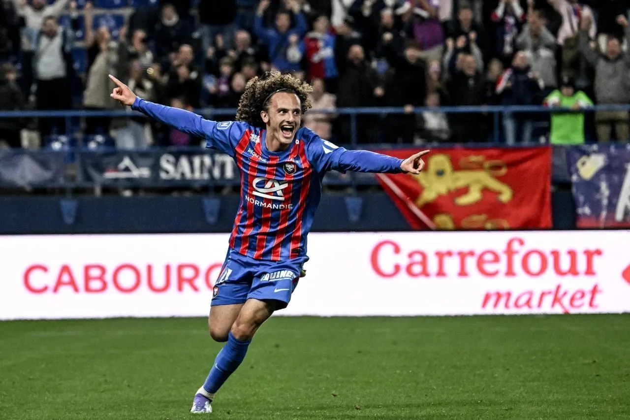 Léo Milliner a inscrit son premier but en pro, avec le SM Caen, vendredi 3 octobre 2025 face au Puy-en-Velay. © Martin Roche / Ouest-France