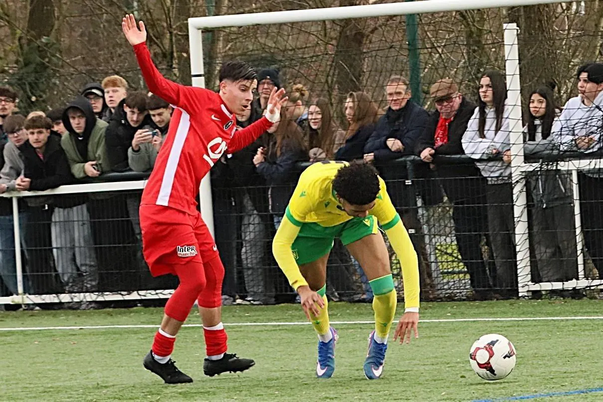 Sacha Benzaqui, à droite, au duel contre Nantes à l’occasion des 16es de finale de la Coupe Gambardella, à Flers (Orne). Le FC Flers s’est incliné 6-0. © Serge Ruer / Ouest-France