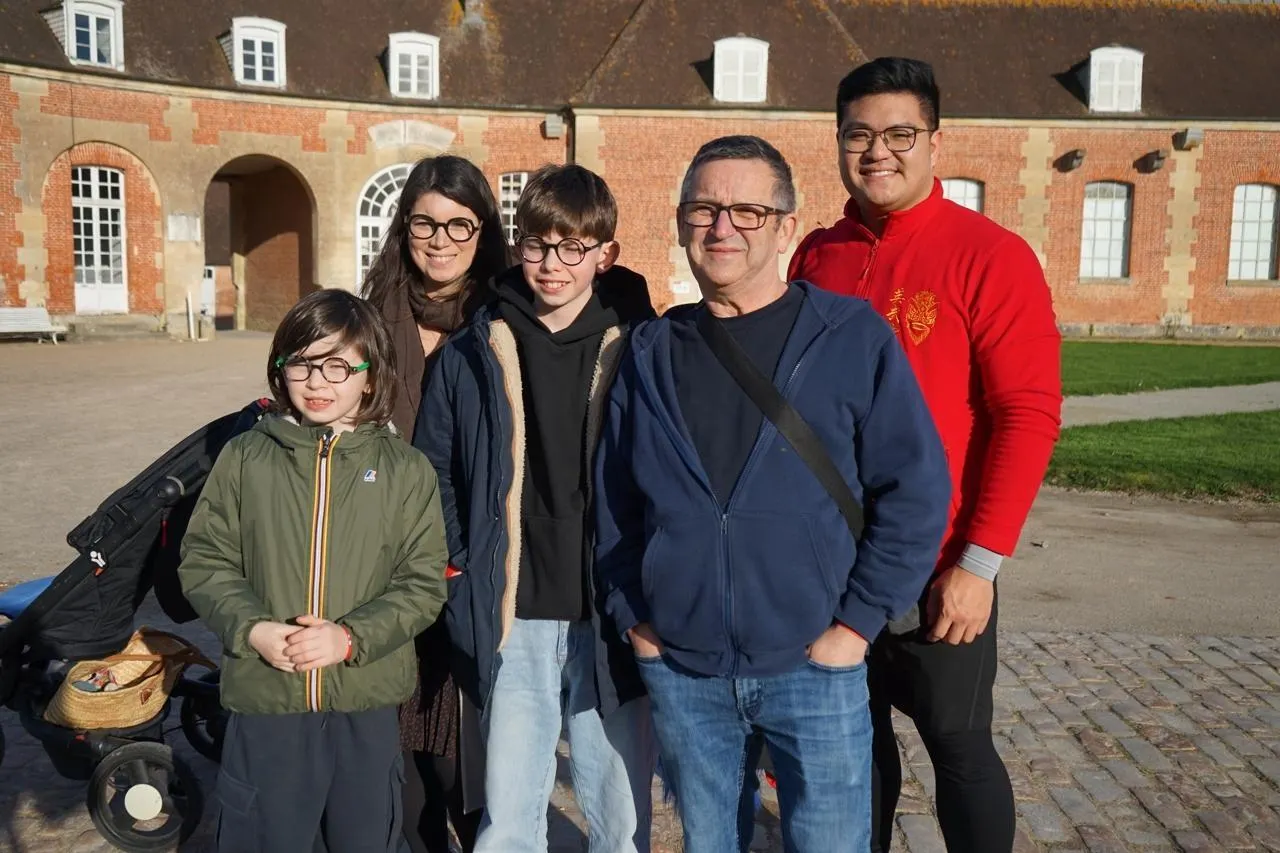 Noémie, entourée de ses enfants et de leur grand-père, pose aux côtés d’un artiste de la danse du lion au haras du Pin. Ouest-France