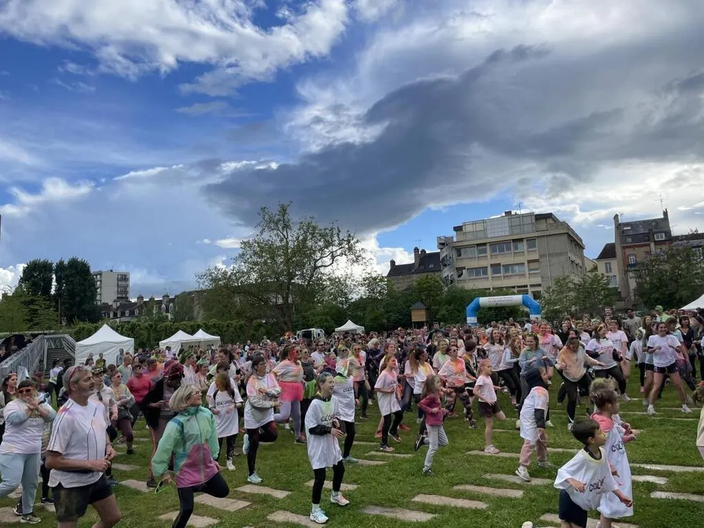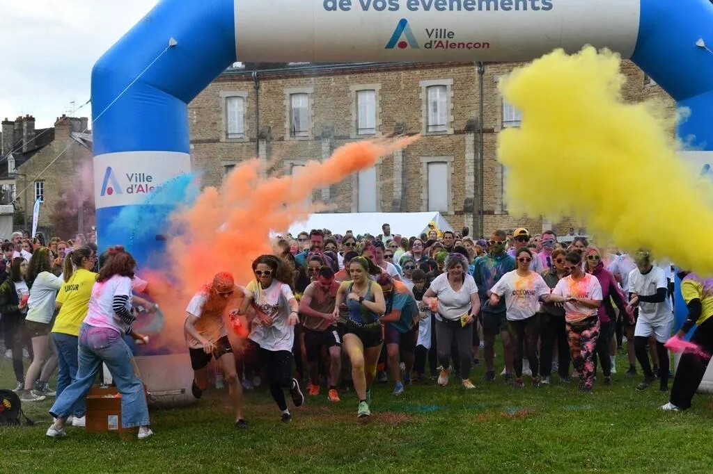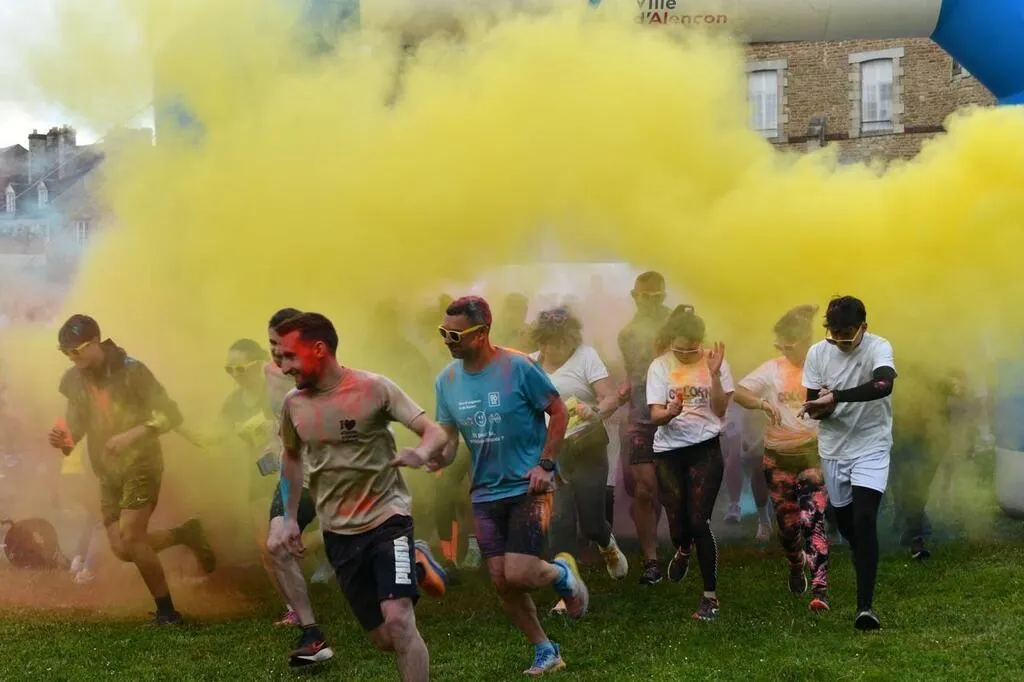 Le départ de la cinquième édition de la Col’Orne, la course colorée des élèves en podologie de l’Ifres, à Alençon (Orne), a été donné jeudi 16 mai, à 18 h 45. 500 participants, sachets de poudre arc-en-ciel dans les mains et lunettes fluo sur le nez, se sont élancés du parc des Promenades.