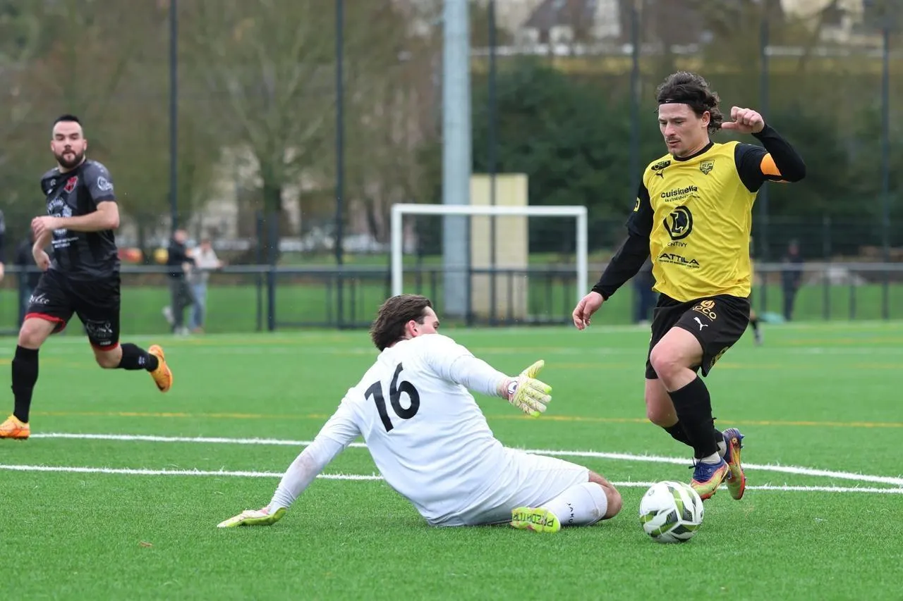 Alexis Derennes efface ici le gardien Kevyn Lembourg pour le 2-0. Après deux doublés consécutifs en championnat, il enchaîne avec sur un triplé en Coupe de Bretagne. © Pascal Granger