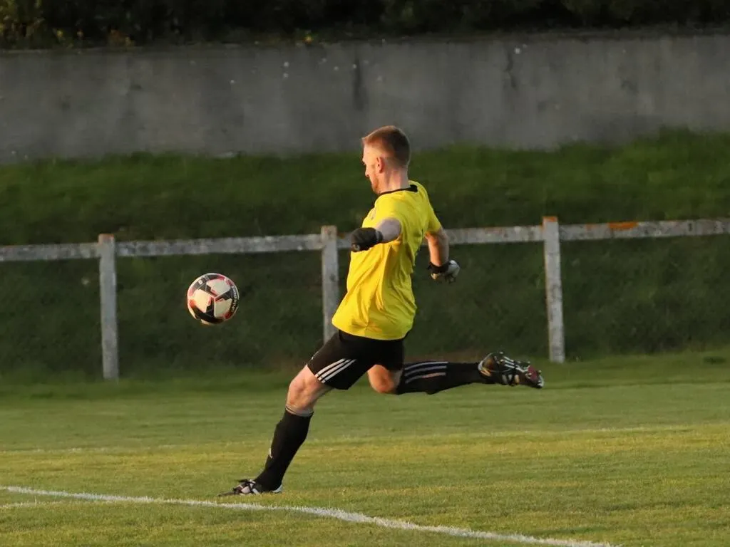 Victor Larguillière, le gardien de but de Domfront, aura sans doute fort à faire sur sa ligne contre Condé-sur-Sarthe, ce samedi (19 h), en Régional 3. © Photo : Serge Ruer
