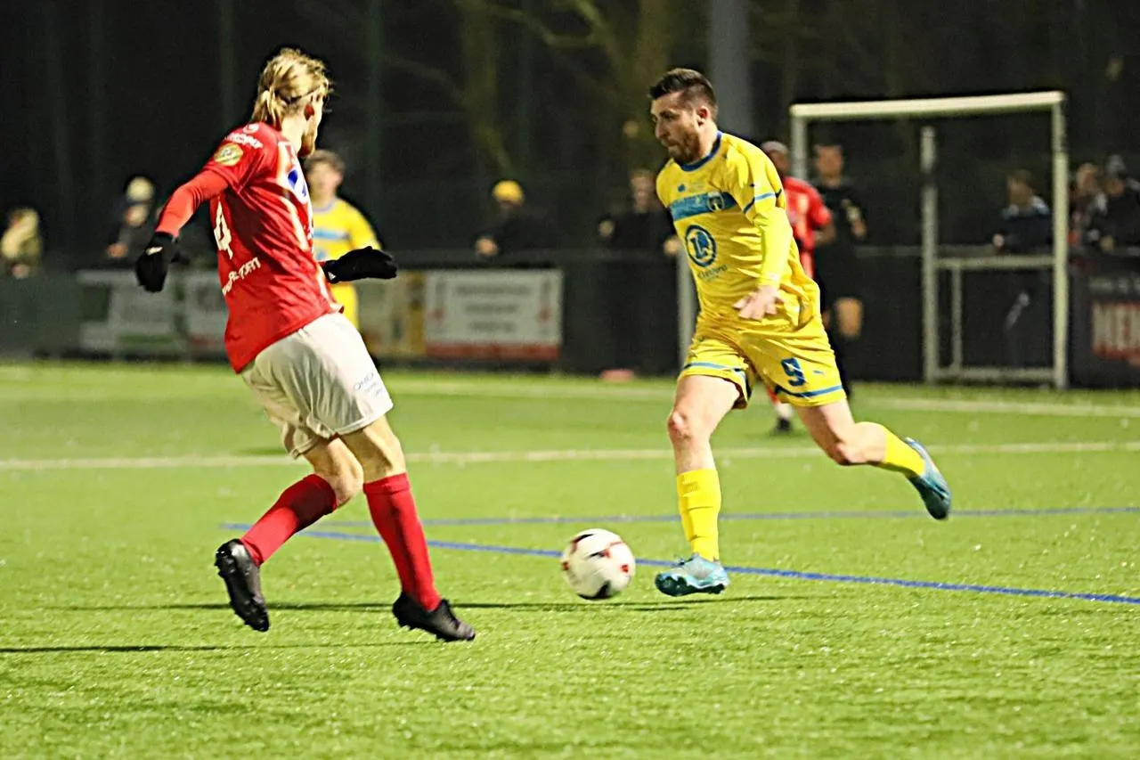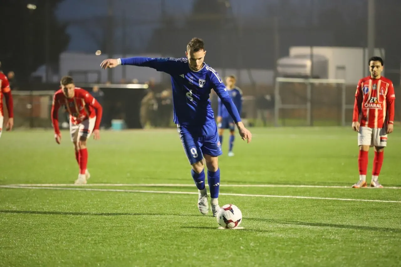 Maxence Danguy a égalisé sur penalty avant qu’Ewann Lecourt donne la victoire à Saint-Lô dans le temps additionne, samedi 7 mars 2026 à Flers. © Serge Ruer