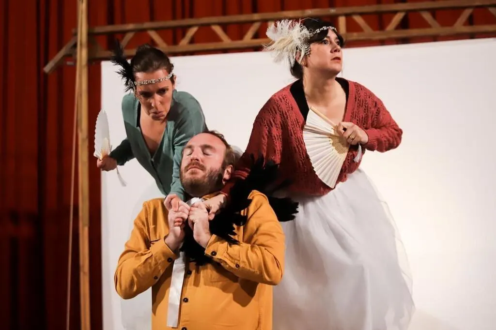 Rémi Dessenoix (au centre), Angèle Soposki (à gauche) et Angèle Rivier, en pleine représentation de « Molière, le combat », pièce qui sera jouée au théâtre du lycée Giel-Don-Bosco, dimanche 23 octobre 2022. © Ouest-France