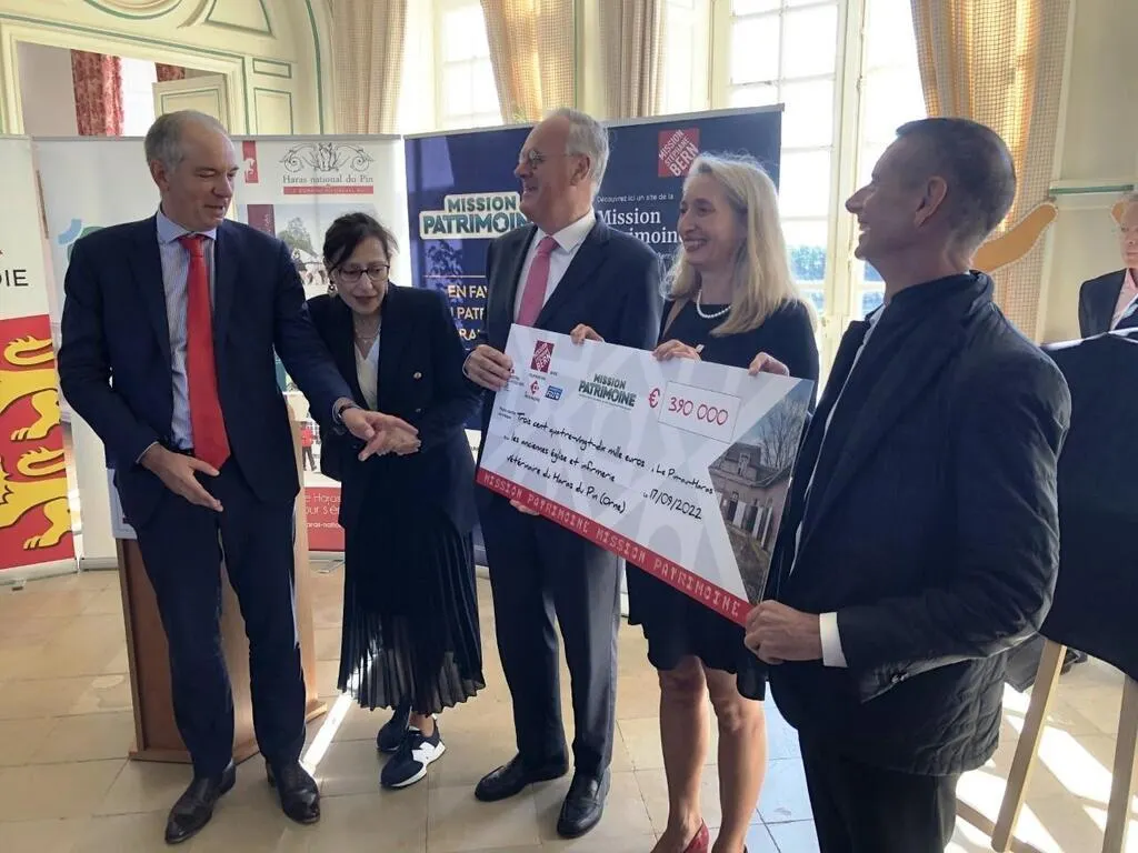 La Française des jeux et la Mission Patrimoine participent financièrement à la prochaine restauration de l’infirmerie vétérinaire du haras du Pin et d’une ancienne église. Le chèque a été remis, samedi 17 septembre 2022, au Pin-au-Haras, lors des Journées du patrimoine.