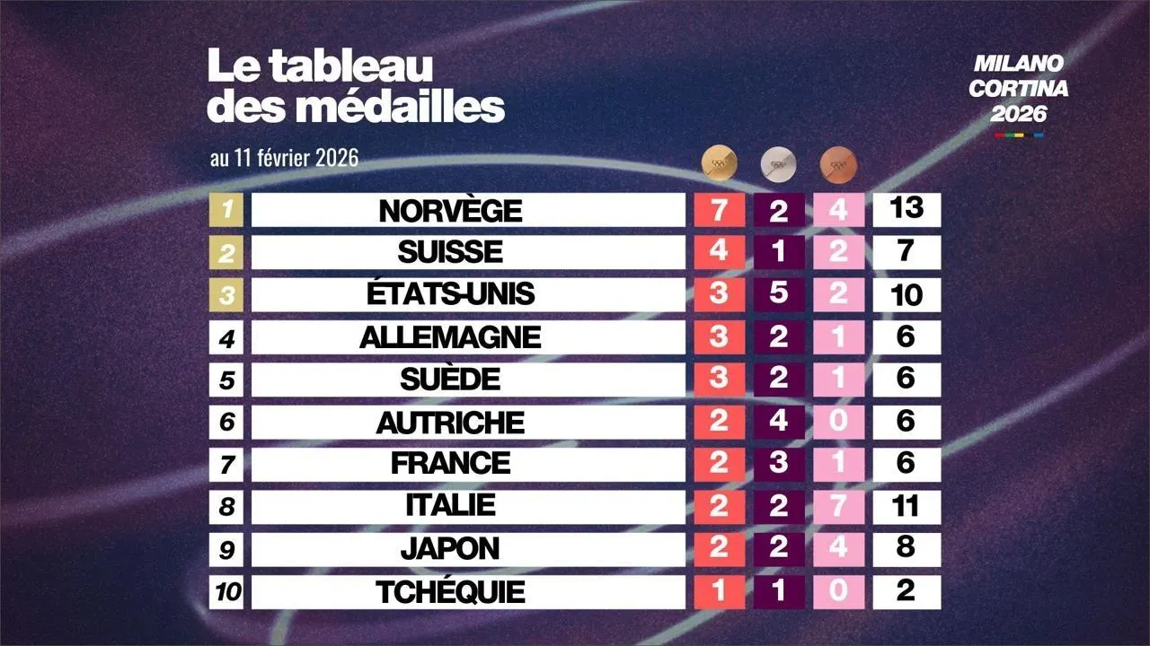 Le tableau des médailles des JO 2026, le mercredi 11 février 2026 actualisé à 16 h 30. Ouest-France
