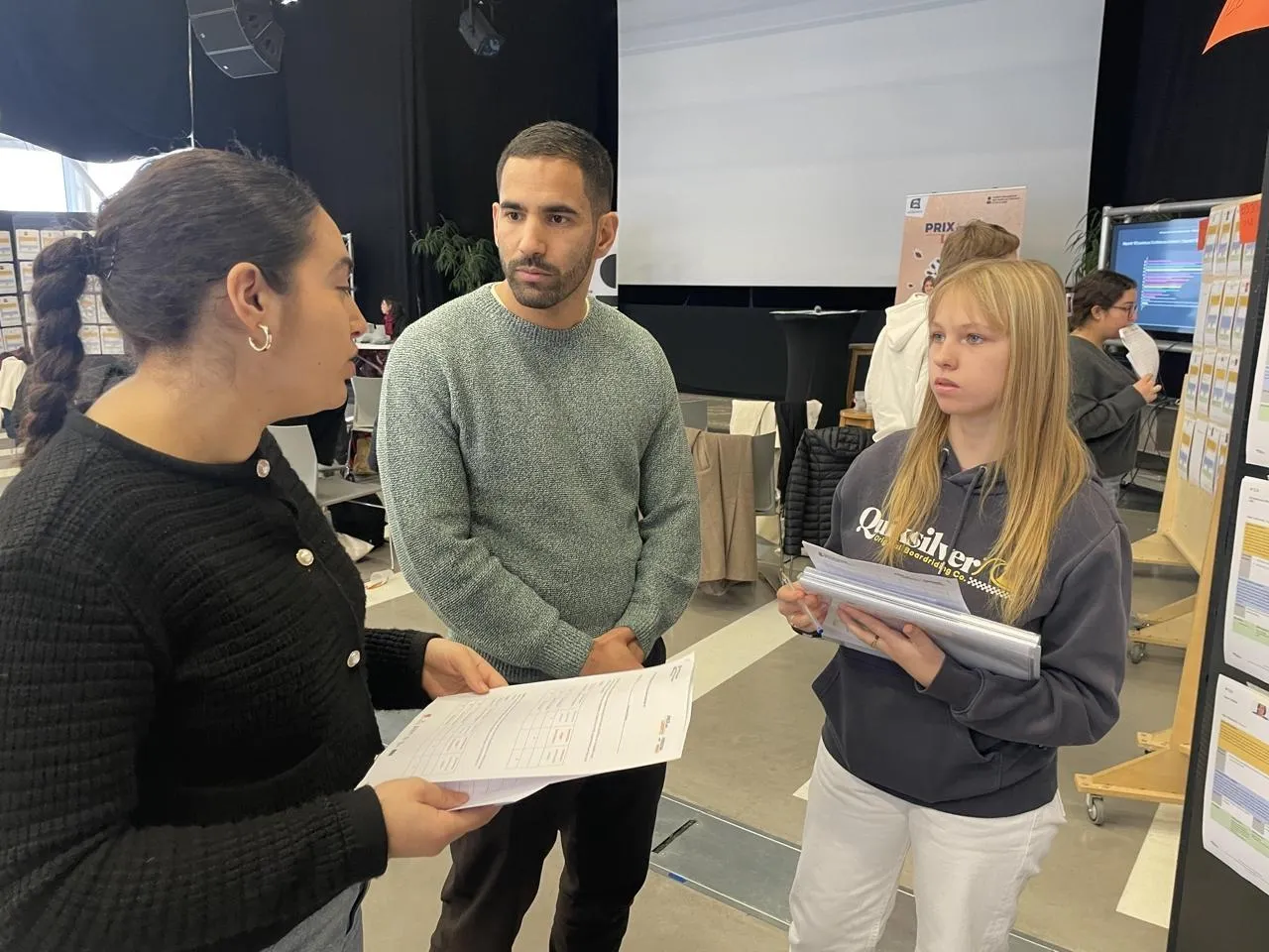 Ouissem Belgacem, président du Prix Liberté 2025, échangent avec deux jeunes filles, membres du jury. Archives Ouest-France