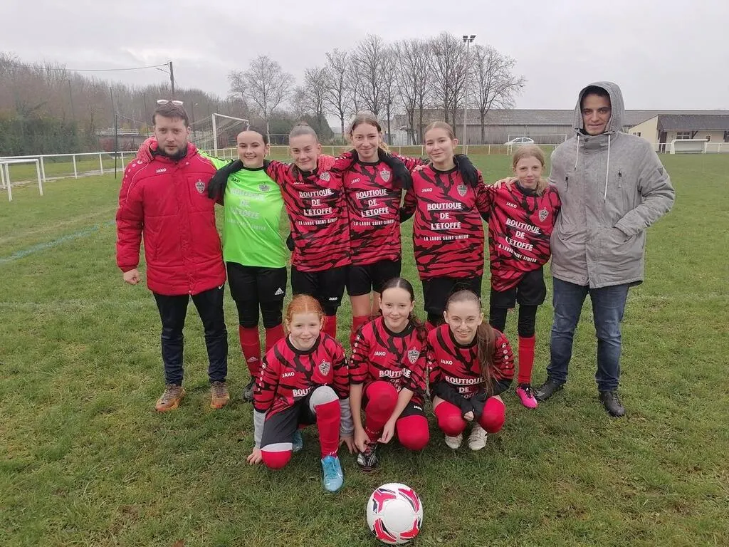 Les joueuses de l’équipe féminine se sont vues remettre un nouveau jeu de maillots officiel, offert par un nouveau partenaire du club : l’épicerie multiservices « l’Étoffe » de La Lande-Saint-Siméon. © Club foot Ségrie