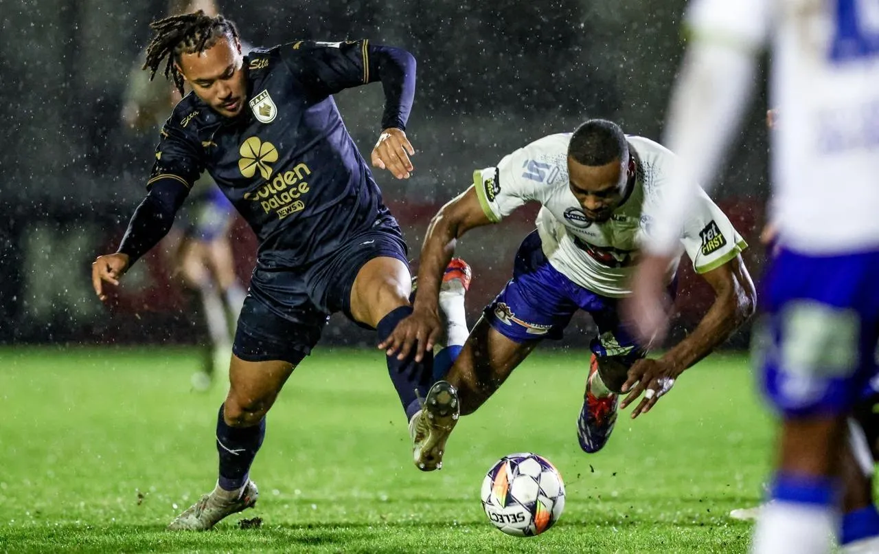 Alexis Beka Beka (à gauche) est entré en fin de match avec La Louvière lors d’une rencontre de Coupe de Belgique. © Bruno Fahy / AFP