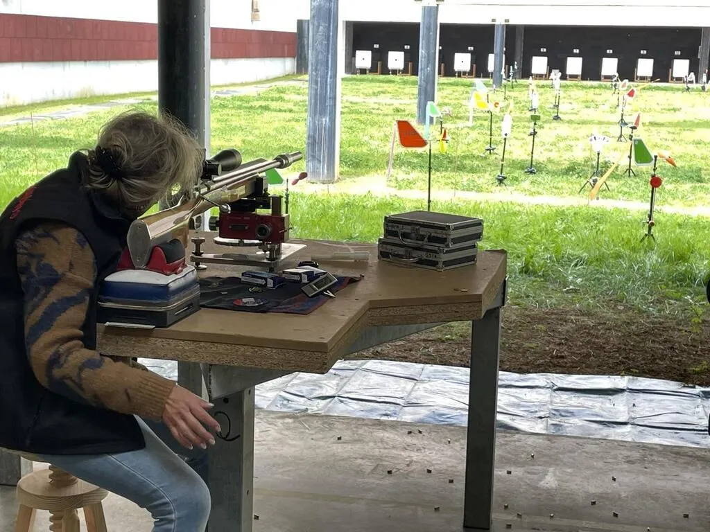 Le rimfire se pratique assis. Les cibles sont à 50 m de la carabine et entre les deux, des girouettes qui aident la tireuse de la photo à "jouer" avec le vent. © Ouest-France