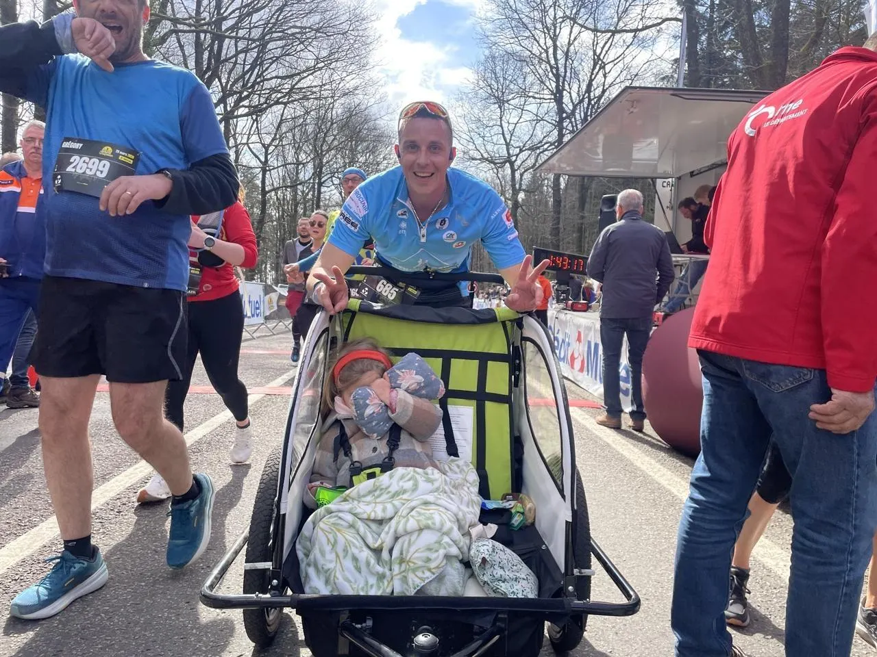 Romain Adelinet a poussé sa fille handicapée Élise durant toute la course Alençon - La Croix Médavy qu’il a parcouru en 1 h 30. © Ouest-France