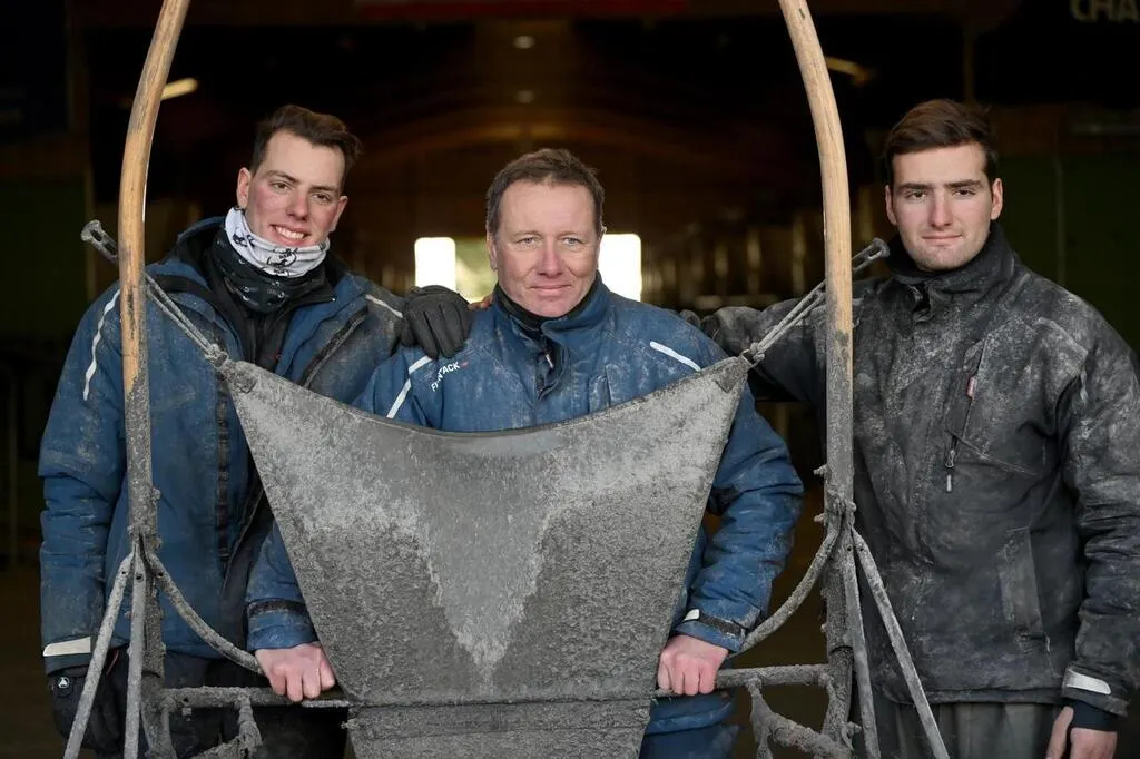Thierry Duvaldestin (centre) tient entre les mains un sulky, entouré de ses fils Théo (gauche) et Clément (droite). © Archives Stephane Geufroi / Ouest-France