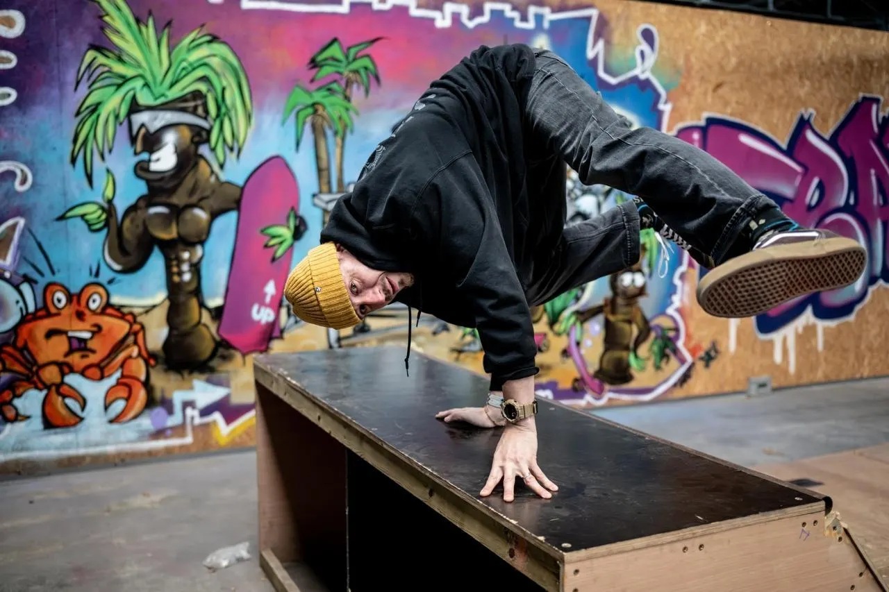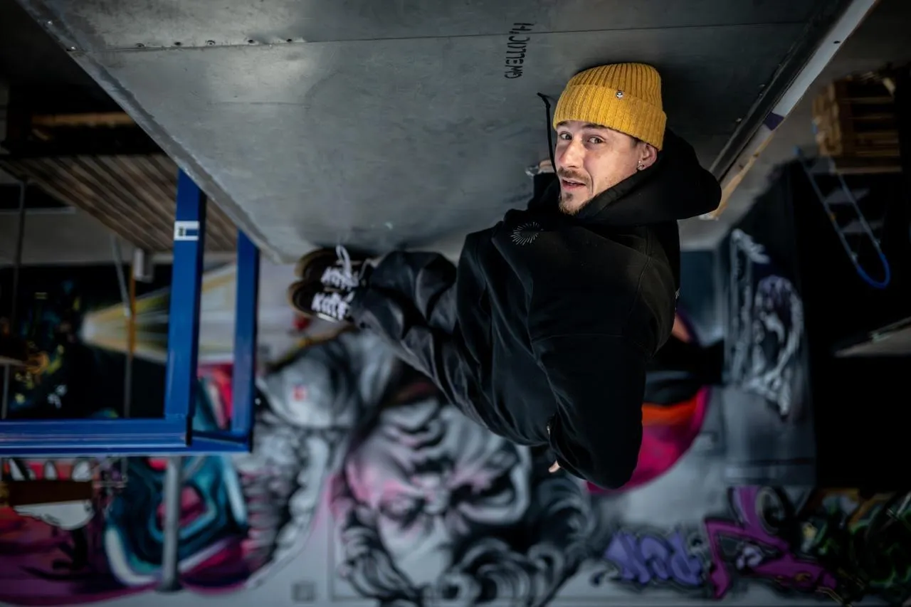 Damien Guillet arrive en retard, donne plus de temps qu’il n’en a, puis doit cavaler pour être le moins en retard possible à son prochain rendez-vous. Pour les photos, il improvise des figures de breakdance sur commande.