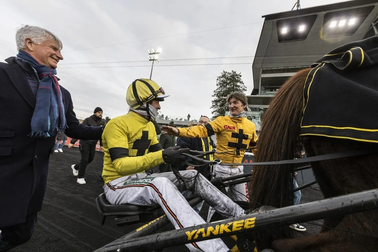 Thomas Levesque ( à droite) et son père Pierre, félicitent Éric Raffin, drive d’Iroise de la Noé lors de la victoire en jaune et noir au Prix de Belgique, le 11 janvier 2026. © © Bruno Vandevelde - Le Trot