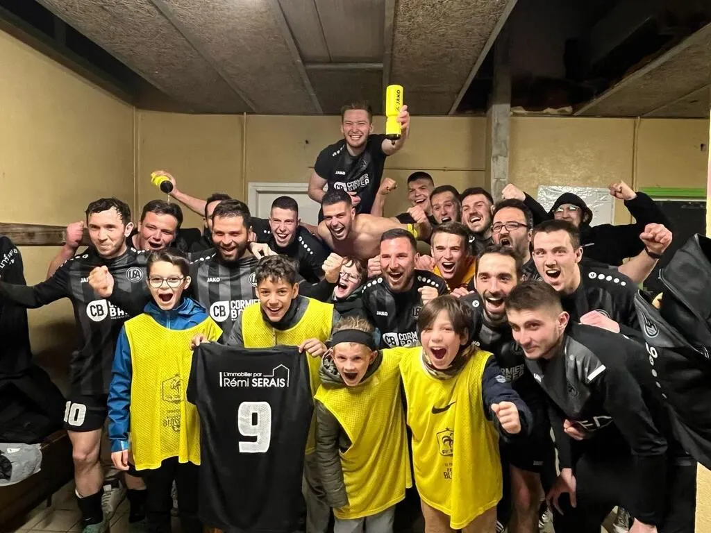 Les jeunes corbenois n’ont pas perdu une miette (ni une goutte) de la fête dans le vestiaire d’Andaine après la rencontre. © Ouest-France