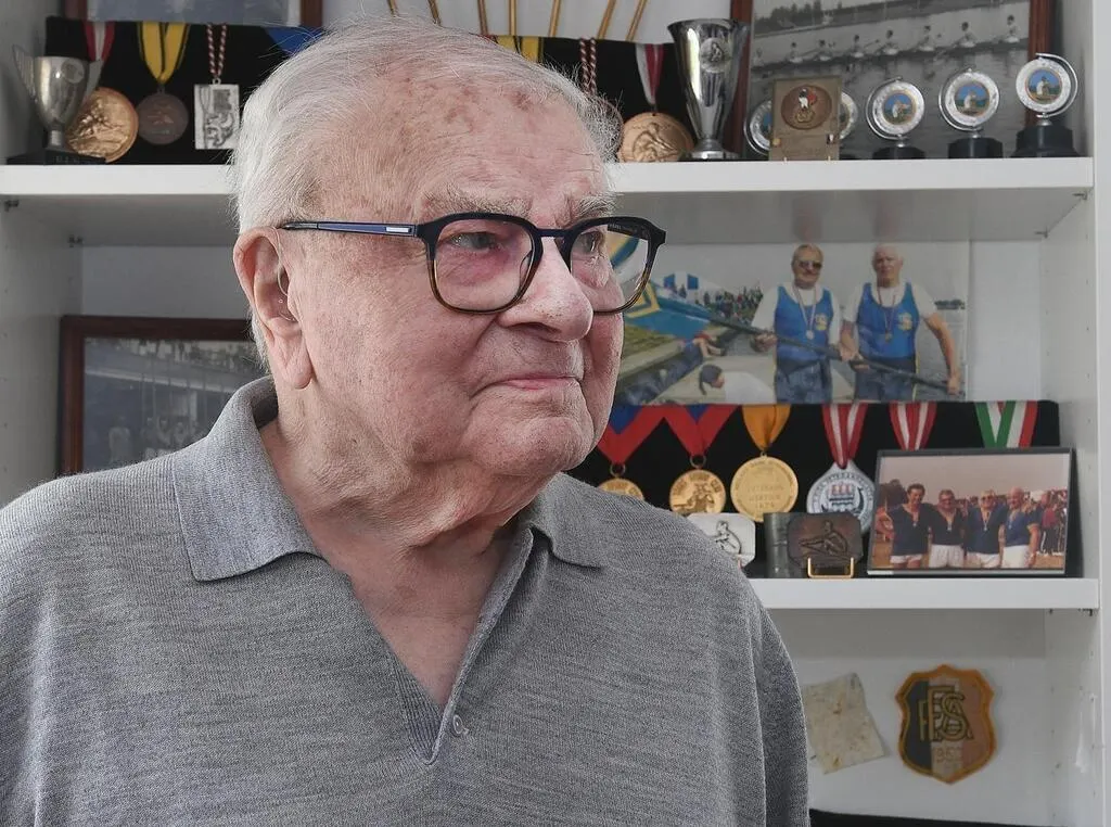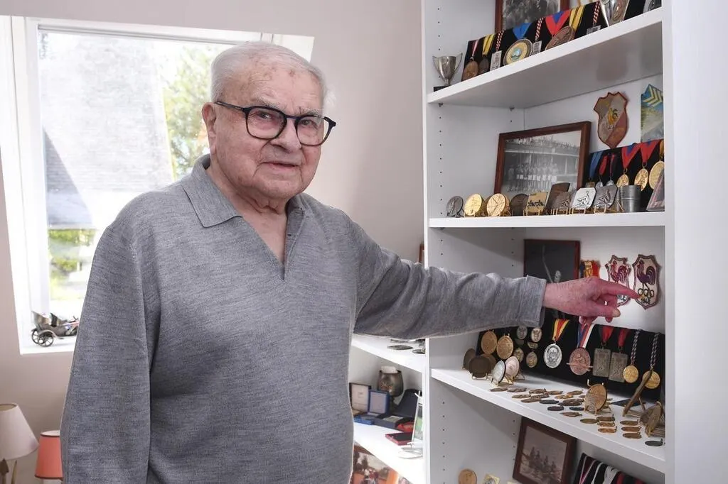 Ancien déporté au camp de Buchenwald, multiple champion de France et du monde d’aviron, participant aux Jeux de Londres 1948… À 101 ans, le Normand Roger Lebranchu, domicilié à Agon-Coutainville (Manche), portera la flamme olympique au Mont Saint-Michel, le 31 mai 2024. Ici, devant l’armoire sur laquelle trônent ses médailles sportives. © Ouest-France