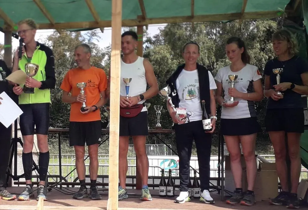 Les podiums masculin et féminin des 18 km du trail de la Lande Forêt avec la victoire de l’espoir de l’ES Falaise Tom Hoppenreijs (à gauche). © Ouest-France