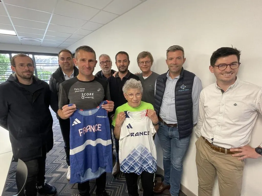 Arnaud Deceroit et Micheline Bailly, entourés des partenaires qui financeront le voyage des deux athlètes aux Mondiaux en Suède, cet été. © Ouest-France