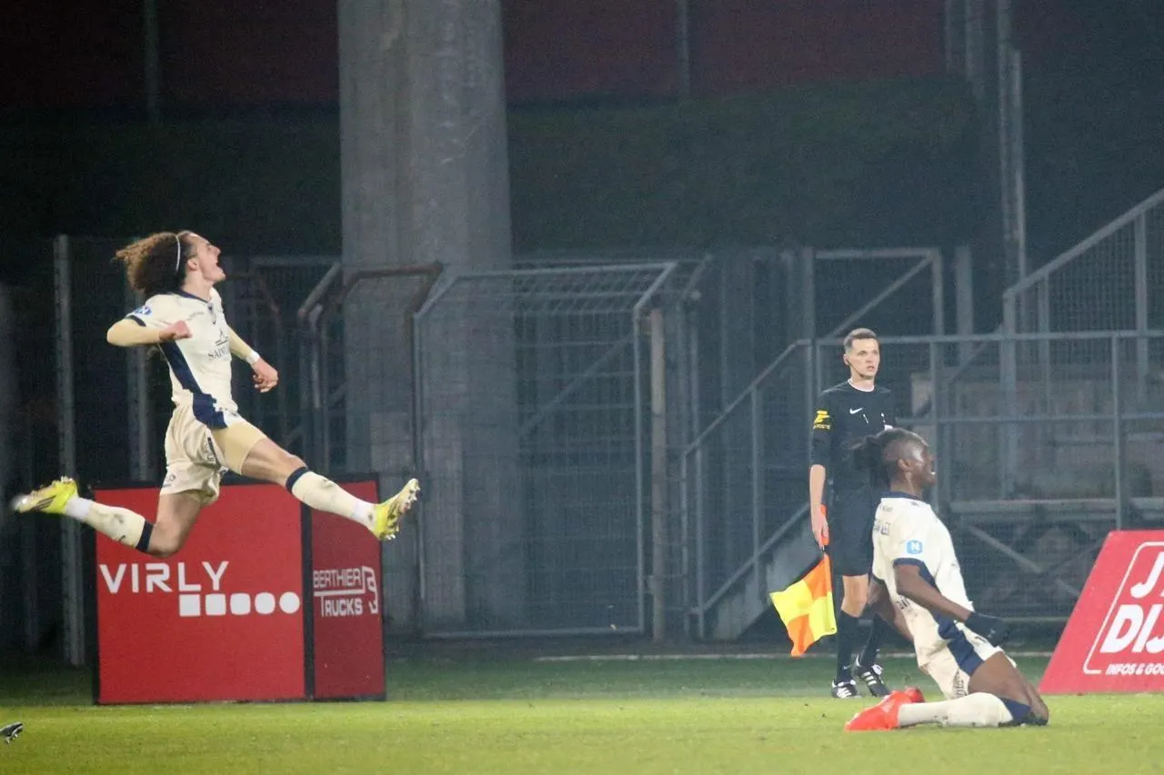 Léo Milliner (à gauche) exulte après le but libérateur d’Armand Gnanduillet (à droite), synonyme d’égalisation en toute fin de match à Dijon (3-3). © NICOLAS GOISQUE/MAXPPP