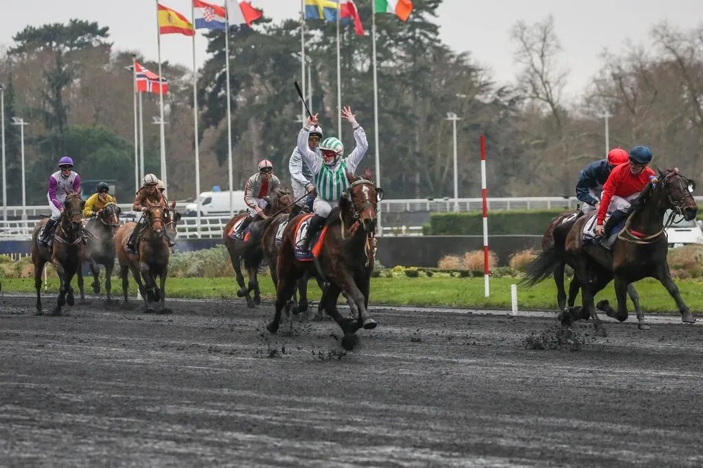 Au passage du poteau, le jockey d’Esperanza idole, Jean-Yann Ricart, n’a pas hésité a levé les bras. Comme sa jument, c’est sa première victoire dans le Prix de Cornulier. © Photo : © Bruno Vandevelde – Le Trot